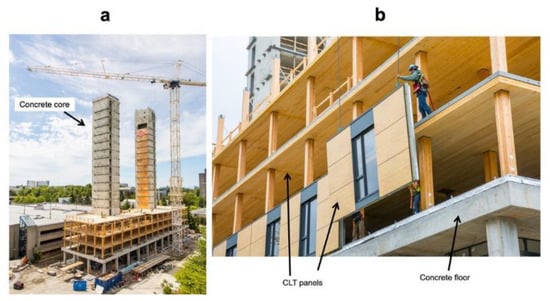 Brock Commons building progress: (a) concrete core and initial floor overview and (b) envelope cross laminated timber (CLT) panel installation. Modified from naturallywood.com; photographer: K.K. Law.