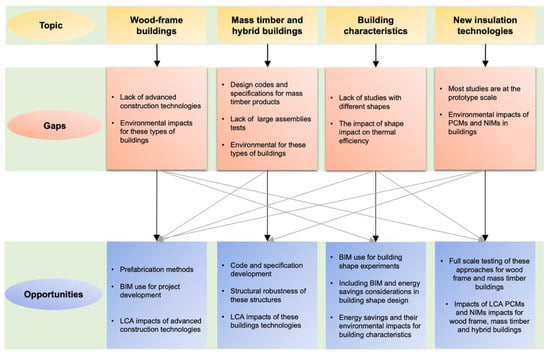 This section presents some recommendations for developing more energy-efficient wood buildings and other aspects identified in the literature to improve the overall performance of wooden buildings. What has been done in the area of construction, materials and technologies to improve the total energy efficiency of wood building systems is summarized in the previous sections. Future research directions can be defined based on the research gaps in the main research topics. Four major topics and their gaps and opportunities are highlighted in Figure 8. In addition, despite some points being directly related, it is important to note that indirect studies also present opportunities for future research.