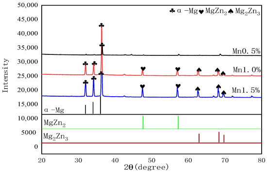 The intermetallic phases such as Mg2Zn3, and MgZn2 appear as peaks in the diffractograms, resulting in eutectic transformation during the sintering process, and these intermetallic phases can improve the corrosion resistance of Mg [19,20], and the highest peak in the α-Mg matrix is the main phase produced from the elemental phase composition prepared. Since the solid solution of manganese in the magnesium matrix is limited, no intermetallic compound is formed between magnesium and manganese, and it is also possible that the manganese content added to this Mg-Zn alloy is so small that it does not produce a great change in the phase organization, resulting in no independent phase generation of manganese; thus, no α-Mn phase peak is observed in the XRD analysis. The different color lines can distinctly represent the different component content and the different phase