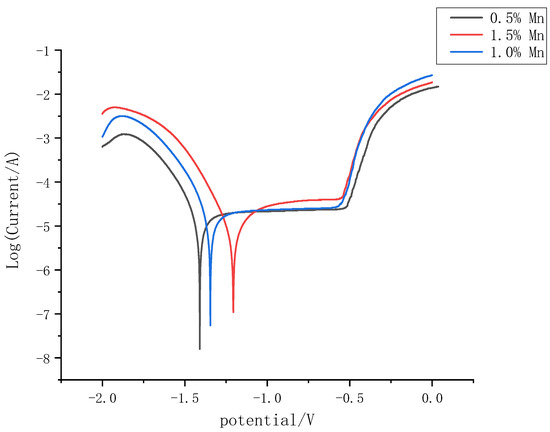The electrochemical SBF of the three Mg-Mn-Zn alloys prepared after powder metallurgy simulates the Tafel polarization curves in human body fluids, as shown in Figure 12. The corrosion parameters (corrosion potential, φcorr, and corrosion current density, Jcorr) for the three Mg-Mn-Zn alloys obtained from the Tafel polarization curves are shown in Table 4. The results show that the alloys with high Mn content have superior corrosion resistance compared to the alloys with less Mn content added. The reason for this is that the addition of Mn reduces the corrosion rate of the Mg-Zn alloy. Mn forms similar oxides such as MnO2 and MnO by reacting with the phosphate in the SBF solution, and such oxides are a protective film similar to the type of conversion film [21], as indicated by the polarization curves; with increasing Mn content, the corrosion potential moves to a higher potential. Such protective films cover the grain-boundary surface, reducing the corrosion rate, delaying the breakdown and pitting of the protective film, and improving the stability of the surface corrosion product film [22], which significantly inhibits the corrosion of magnesium alloys; thus, the addition of Mn reduces the corrosion rate of the alloy.