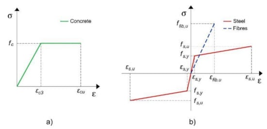 The constitutive behavior of concrete, steel, and fibers is shown in Figure 2 according to Eurocode 2 [32]. In the case of concrete, bilinear simplification was considered (Figure 2a). Regarding the steel, an elastic–plastic diagram was used, considering the strain-hardening phenomenon after yielding (Figure 2b). The fibers were assumed to be linear–elastic until failure (Figure 2b). The tensile strength of the concrete and the mortar-FRCM was not considered.