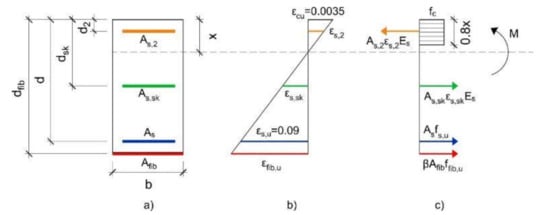 Hence, the analytical method for determining the ultimate flexural capacity of the strengthened RC beams is based on the following assumptions: (1) Failure of the strengthening composite while the substrate and bonding maintain their capacities, (2) strain compatibility during the loading process, (3) equilibrium of the forces of the load-bearing cross-section, and (4) reduction of the tensile fiber capacities by a mixed failure of fibers and mortar relative slip.