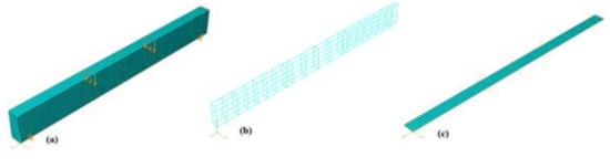 Numerical model of beams: (a) Deformable solid beam, (b) truss element-reinforced steel, and (c) shell element FRCMs.