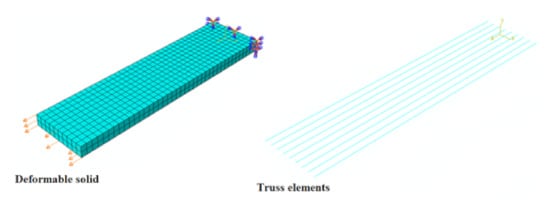 Truss elements were used to simulate steel reinforcement (longitudinal steel bars and stirrups) (Figure 4b). A simplified steel elastic–plastic curve (Figure 2b) obtained from the experimental results was assigned to these reinforcement elements.