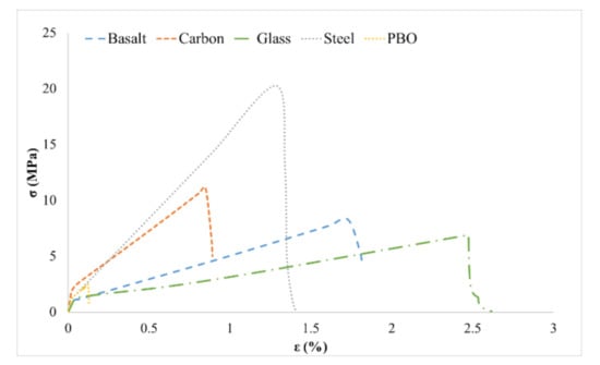However, the FRCMs that presented the highest loss of the withstanding capacity with regard to the tensile strength of the fibers were those made of PBO, carbon, and basalt fabrics. These phenomena may be caused by the poor impregnation of dry fibers by the cementitious matrix, in which the inner filaments of the rovings are not in contact with the mortar, and stress distributions in the yarn are not homogeneous (see Hegger et al. [34]).