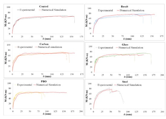 - The numerical model was effective for carbon-, basalt-, glass-, and steel-FRCM-strengthened beams for predicting the bending moments and displacement (variation between 2% and 15%) due to the coefficient β determined in the analytical approach. However, in the case of PBO-FRMC, it was not possible to reproduce the experimental results, because the failure criterion was reached at a very large deflection bigger (variation of 97%) than its experimental failure.