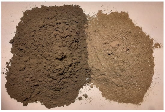 The cement used was Portland cement, CEM I 42.5 R, according to EN 197-1 [26]. The chemical composition of cement and CWA was determined by XRF (X-Ray Fluorescence) analysis using Thermo Scientific ARL Perform’X Sequential XRF (Thermo Fisher Scientific Inc., Walthem, MA, USA) on molten discs prepared by mixing sample and Fluxana (FX-X50-2, lithium tetraborate 50%/lithium metaborate 50%). The data listed in Table 1 were evaluated using the UniQuant program (Version 4.1). The density of the cement, measured according to EN 196-6 [27], was 3140 kg/m3. Figure 1 shows the appearance of cement (left) and CWA (right).