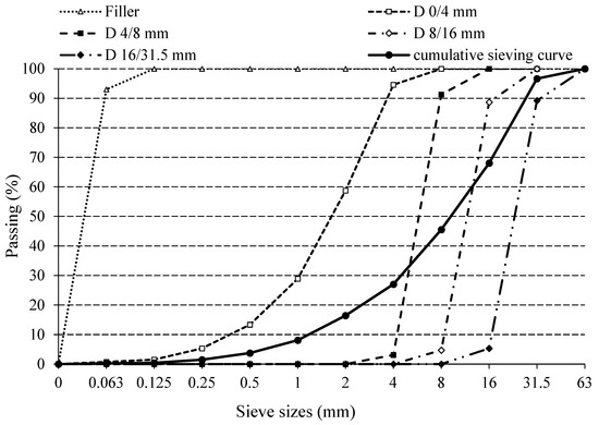 All concrete mixes investigated in this study were prepared with dolomite aggregates (fractions corresponding to 0/4 mm, 4/8 mm, 8/16 mm and 16/31.5 mm) whose particle size distribution was determined according to EN 933-1 [28], as shown in Figure 2. The filler used was dolomite with passing of 93% for sieve size 0.063 mm and 100% for sieve size 0.125 mm. The density of the crushed dolomite aggregate was 2750 kg/m3, while the density of the filler was 2760 kg/m3 and tested according to EN 1097-6 [29].