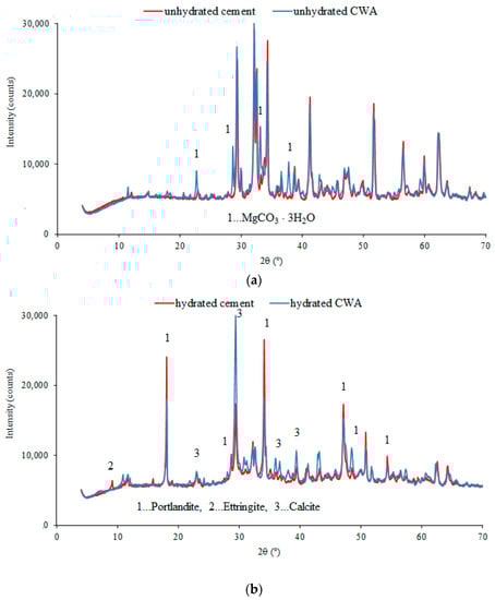 XRD diffractogram of cement and CWA: (a) before hydration and (b) after 57 days of hydration.