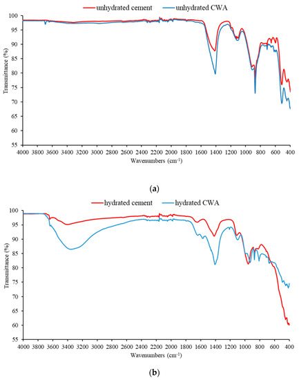 FTIR of cement and CWA: (a) before hydration and (b) after 95 days of hydration.