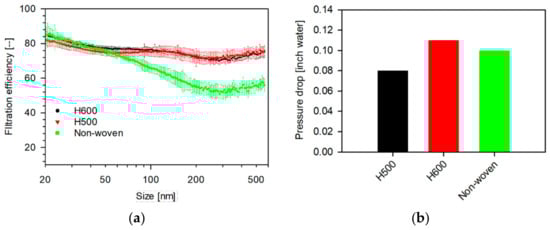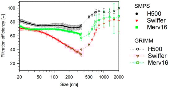 The size-dependent filtration efficiencies of Halyard 500 (H500, Halyard Health, Alpharetta, GA, USA), Swiffer (Dust cleaner, P&G, Cincinnati, OH, USA), and MERV-16 (HVAC) are shown in Figure 3.