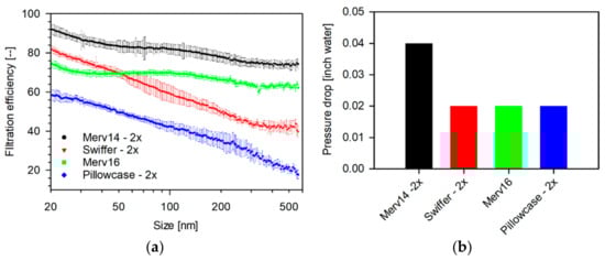Two layers of MERV-14 showed the highest filtration efficiency (94.9–73.3%) amongst the household media as seen in Figure 4, whereas the double-layered pillowcase showed the lowest (61.0–17.8%).