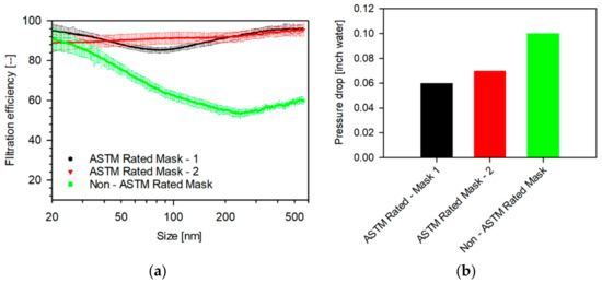The filtration efficiencies of isolation masks are plotted in Figure 6. The masks are classified based on whether they were ASTM rated. The ASTM-rated masks show the highest filtration efficiencies. ASTM Rated Mask-1 showed filtration efficiencies between 96.3 and 85.2% with a steep minimum around 80 nm, while the ASTM Rated Mask-2 showed slightly higher efficiencies ranging between 95.6 and 88.7%, with an increasing profile with size. The non-ASTM rated mask showed lower filtration efficiencies (92.1–53.2%), with minimum near 250 nm with a gradual decrease in filtration efficiency with increasing sizes. The pressure drops incurred by different media are shown in Figure 4b, Figure 5b and Figure 6b, respectively. The household media showed lower pressure drops (0.02–0.04-inch water), whereas the sterilization wrap fabrics showed higher pressure drops (0.08–0.11-inch water). The isolation masks showed mid-range pressure drops (0.06–0.1-inch water). Therefore, ASTM rated isolation masks are superior filtration media as they show higher filtration efficiencies with lower pressure drops.