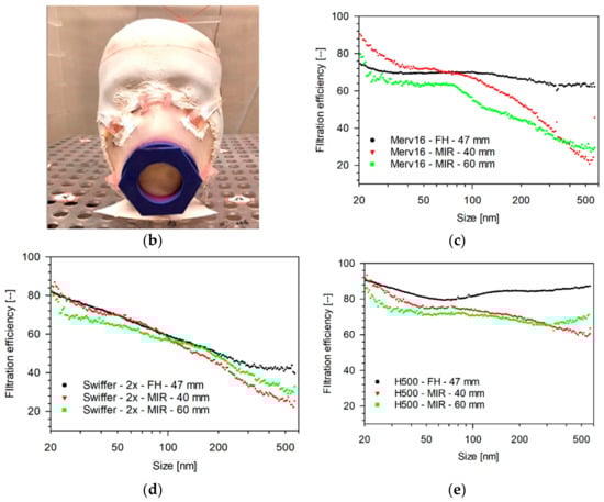 (a) 3D rendering and .stl file of 3D-printed mask (40 mm) (b) 3D printed MIR mask (40 mm) fitted and sealed on mannequin. Size-dependent filtration efficiency (c) MERV16, (d) double-layer Swiffer, and (e) H500 material tested as 47 mm punches measured in a filter-holder-based system and in 3D printed MIR masks. (Face velocity: 4.2 cm s−1, aerosol: 0.3 M NaCl, NTOT: 2 × 106 #/cm3, RH: 43–47%, and scan-time: 1 min (SMPS).