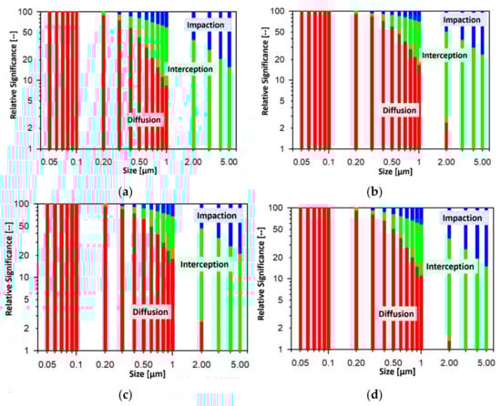 Relative significance of different filtration mechanisms on the size-dependent filtration efficiencies of (a) H500, (b) H600, (c) Swiffer, and (d) MERV16.