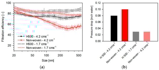 The filtration efficiency is a strong function of face velocity [30]. In order to evaluate the influence of face velocity on the size-dependent filtration efficiency, experiments were performed at face velocities of 1.7 and 4.2 cm/s. The measured filtration efficiencies and pressure drops at these flow rates for H500 and non-woven are shown in Figure 10a,b, respectively. It can be seen that at higher face velocities, the filtration efficiency is lower for all sizes and the magnitude of decrease becomes more significant at relatively larger particle sizes. High face velocity decreases residence time for particle in the vicinity of the fiber and hence reduces filtration efficiency due to diffusion. This is also in accordance with the theoretical filtration efficiency predicted by Equation (2), wherein it is proportional to the negative two-third power of Peclet number. As per the Equation (8), filtration efficiency due to interception does not depend directly on face-velocity. Although filtration due to impaction is proportional to face velocity, as discussed in Section 3.3.2, impaction does not influence filtration efficiency for particle sizes considered (0.02–0.5 μm). It can also be observed that the pressure drops increase with increasing face velocity, which is a direct consequence of Darcy’s law, as discussed below.
