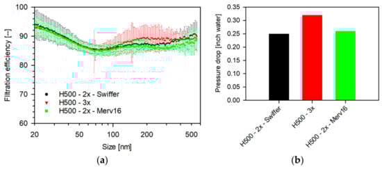 There may be practical and safety reasons that if materials such as Swiffer or MERV-16 are utilized, they will be sandwiched between two layers of fabrics such as H500. It can be seen from the Figure 11 that the filtration efficiencies of all the three combinations discussed follow a strikingly similar profile (95.8–85.3%), with the combinations that include Swiffer/MERV-16 showing a lower pressure drop (Figure 11b). This result emphasizes the need for studying different combination of filter media. Furthermore, Darcy’s law was used to calculate specific clean filter resistance (Equation (13)),