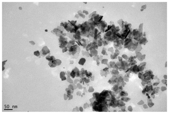 For the preparation of our sample glass, flakes from the system 40BaO-33-B2O3-27(Fe2O3+CoOTiO2) (mol%) with a substitution degree of were heat-treated at 650 C for 4 h. The effect of decreasing magnetocrystalline anisotropy by CoTi-substitution might be superimposed by super-paramagnetism due to the small particle size. The magnetic nanoparticles we obtained using this method are platelike with an average size of ∼35 nm by ∼4 nm (thickness). A TEM image (Zeiss DSM 960, Jena, Germany) of the particles is given in Figure 1. Magnetic measurements were performed using a vibrating sample magnetometer Lake Shore 7407 (Westerville, OH, USA). The particles in powder form have the following magnetic properties: coercivity = 7.6 kA/m; relative remanence = 0.170; specific saturation magnetisation = 37.8 Am/kg.