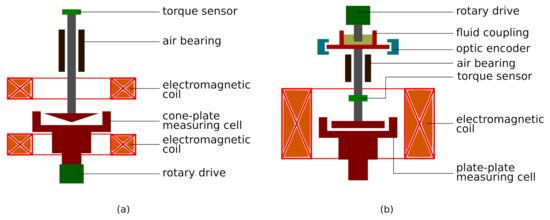 Rheometric equipment: (a) shear rate and (b) shear-stress-controlled experimental setup. A detailed description and evaluation of the equipment is given in [1,23], respectively.