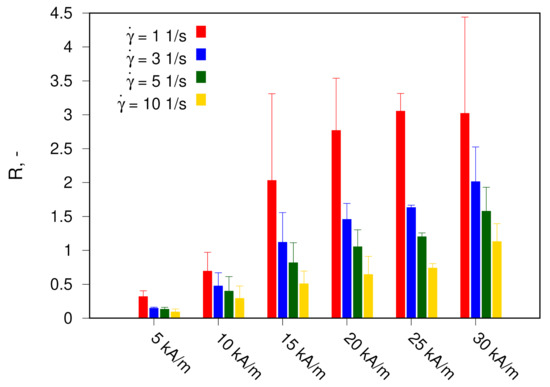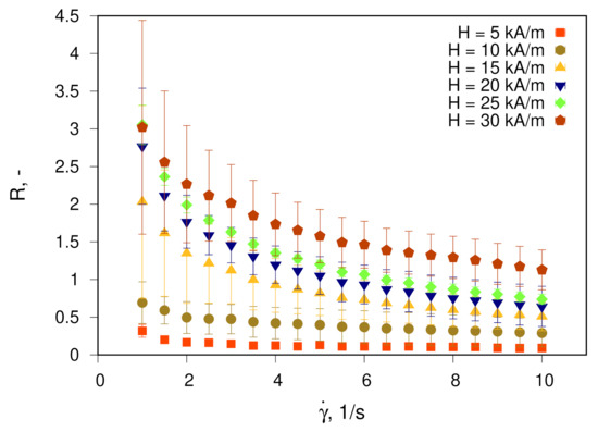 The results of the MVE measurement are shown in Figure 3 and Figure 4. Figure 3 demonstrates the dependence of parameter R on the shear rate for various magnetic fields H, while in Figure 4, values of R for four different shear rates at various H are given as a bar chart.
