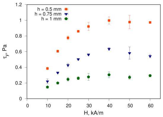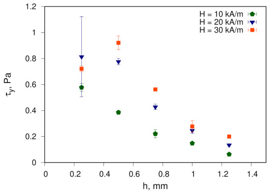 Yield stress for the studied ferrofluid as a function of the applied magnetic field for various distances between the walls in plate–plate geometry.