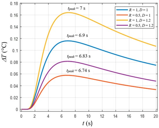 Differential temperature signal (ΔT) curves vs. time for different values of thermal reflection coefficient R and defect diameter D (obtained by Equation (4), Q0 = 10,000 J/m2, e = 538 W·s1/2·m−2·K−1, α = 0.58·10−7 m2/s, d = 1 mm, m = 1, n = 10).