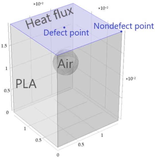 The numerical modeling was performed by using the Comsol Multiphysics software (version 5.0, Comsol, Stockholm, Sweden). The model simulated 3D heat conduction in a solid block (5 mm × 5 mm × 20 mm, 10 mm × 10 mm × 20 mm and 15 mm × 15 mm × 20 mm) with an air defect inside. Different shapes of defects were analyzed, such as FBH, disk and sphere. Three detect diameters D (1, 3 and 5 mm) and three depths corresponding to the size/depth ratios of 5, 2 and 1 were considered for all types of the defects. The depth was determined as the distance from the front sample surface to the upper border point of the defects. An example of the model is shown in Figure 2.