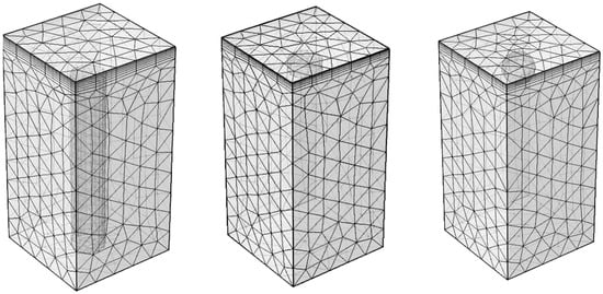 The finite element mesh contained from 10,372 to 38,597 tetrahedron elements (more elements for smaller defects). An average size of each element was 2 mm; however, a boundary layer with elements of thickness about 0.1–0.3 mm was placed on the top surface. Examples of used meshes for different defect types are shown in Figure 3. A regular time step of 0.05 s was used in computations. Modeling results were presented as temperature evolutions at surface defect and non-defect points with the time interval of 0.05 s (Figure 2). The model included a “Heat transfer in solids” physical interface and a time-dependent solver. The temperature evolution was obtained by 1D cut points.