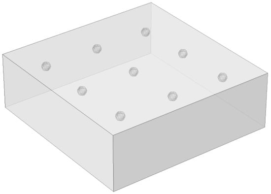 3D printing technologies allow for the manufacturing samples of complicated geometries including defects, such as voids, inclusions, air bubbles, etc. Nine 60 mm × 60 mm × 20 mm PAL samples containing defects of three types (FBH, disk and sphere) with varying lateral size and depth were printed for experimentation. An example of the sample containing nine 3 mm-diameter sphere-like defects is shown in Figure 4, and the parameters of all sphere-like artificial defects are listed in Table 2; note that the defect depth is defined as the distance from the top surface of the sample to the top point of the defect. Additionally, a 60 mm × 60 mm × 2 mm defect-free sample was manufactured for evaluating PAL thermal diffusivity.