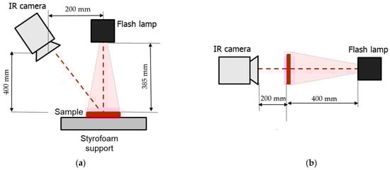 The experimental setup included a FLIR SC7650 IR (FLIR Systems, Wilsonville, OR, USA) camera and a Hensel EH Pro 6000 (Hensel, Fairfield, NJ, USA) flash tube (optical pulse energy 6 kJ, pulse duration 6 ms, distance to the sample 385 mm). The reflector of the flash tube was covered with a protective glass to cut spurious IR radiation. Image sequences consisting of 2500 IR thermograms (320 × 256 image format) were captured with a 50 Hz acquisition rate and 1.432 ms integration time. The schemes of one- (reflection mode) and two-sided (transmission mode) thermal NDT procedures are presented in Figure 5 (the setup of Figure 5b was used for determining diffusivity).
