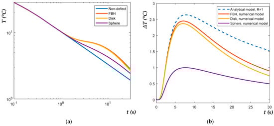 Figure 6a illustrates the results of numerical modeling for three types of defects (FBH, disk and sphere) with the same diameter (D = 3 mm) and depth (d = 0.6 mm). The temperature development in non-defect areas corresponds with the analytical solution for the semi-infinite body with the same thermal properties and represents the straight line with a slope of −0.5 on the logarithmic scale. For the defects, the temperature developments experience some deviations from the straight line, which are different for the different defect shapes (Figure 6a). This feature becomes more illustrative in the curves reflecting the contrasts, ΔT(t) = Td(t) − Tnd(t); see Figure 6b. Figure 6b also shows the comparison between the numerical and analytical (by Equation (4)) values of ΔT(t) obtained for the identical test conditions; note the thermal reflection coefficient R = 1.