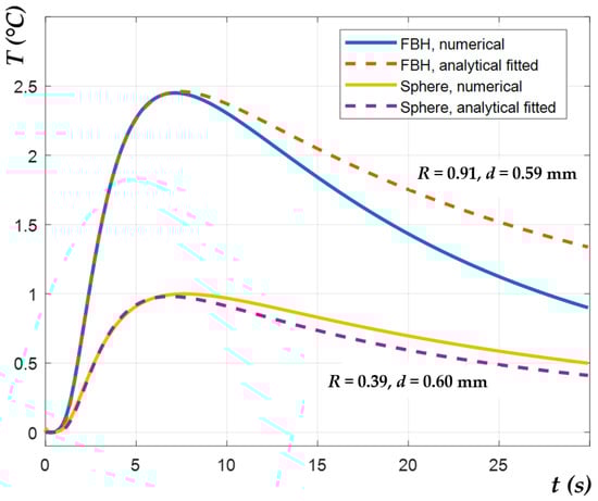 Evolutions of temperature contrasts ΔT for FBH and spheres with D = 3 mm and d = 0.6 mm obtained by numerical and analytical modelling with fitted d and R parameters.