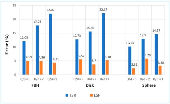 Within the considered time interval, the analytical model was found to fit very well to the numerical data. The depth values predicted by the NLF algorithm (analytical data) were compared with the results obtained by the second time derivative (Thermographic Signal Reconstruction–TSR) method applied to the numerical results [2]. The TSR technique was chosen for the comparison because it is weakly affected by 3D heat conduction, thus being very appropriate for evaluating low aspect ratio defects [33]. The comparison results are presented in Appendix A. However, the suggested NLF algorithm, which accounts for the defect size and thermal reflection at defect boundaries, revealed more accurate results of the defect characterization prediction than the TSR method. It is worth noting that the fitted values of R varied not only with defect shape but also with defect depth and diameter. In general, the thermal reflection coefficient was increasing with greater defect depths and diameters. Respectively, the R values in the case of FBH and disk-like defects (R = 0.7–1) were higher than those for spheres (R = 0.3–0.6), even if some deviations from this result were also observed. In fact, the proposed thermal NDT model is simplified and does not fully reflect the complexity of the 3D heat transfer phenomena in defect areas. Additionally, note that the R values retrieved by fitting do not represent true values of the thermal reflection between two materials, because they are affected by 3D heat conduction. In general, the results presented above illustrate the efficiency of the proposed approach for predicting defect depth in the case of low defect aspect ratios. Figure 8 illustrates the mean relative error of depth estimation M for the analyzed defects, with different aspect ratios obtained by the TSR and NLF methods. Here M is defined as
