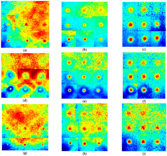 Synthetic IR thermograms of tested samples: (a) FBH, D = 1 mm, (b) FBH, D = 3 mm, (c) FBH, D = 5 mm, (d) disk, D = 1 mm, (e) disk, D = 3 mm, (f) disk, D = 5 mm, (g) sphere, D = 1 mm, (h) sphere, D = 3 mm, (i) sphere, D = 5 mm.