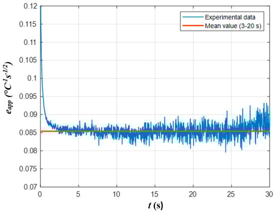 The apparent effusivity was computed by applying Equation (5) to experimental temperature developments, thus producing the sequences of apparent effusivity maps. Since apparent effusivity depends on absorbed energy Q0, only the effusivity magnitude in chosen reference areas was taken into account in calculations. For an adiabatic semi-infinite body heated by a Dirac pulse, the analytical function “apparent effusivity vs. time” represents a straight line parallel to the x-axis. However, the corresponding experimental functions are distorted by the influence of heat pulse duration and surface heat losses, as well as by spatial/temporal noises of various origins. Therefore, in this study, the apparent effusivity was taken as a mean value in a chosen reference area within the time interval of 3–20 s, where the retrieved apparent effusivity values are weakly affected by pulse duration and heat losses. Figure 10 shows the development of both theoretical and experimental apparent effusivity with time (time interval 3–20 s, FBH, D = 3 mm, d = 0.6 mm).
