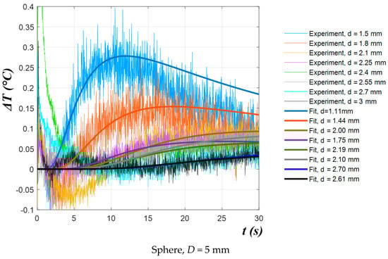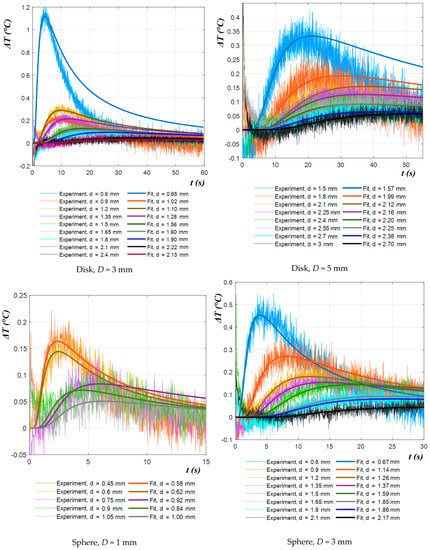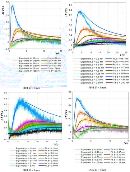 It was shown in [22] that both experimental and simulated temperature evolutions can effectively be fitted with Equation (4) at the rising slope of ΔT(t) curves, while major discrepancies between fitted and original data occurred at longer times. Therefore, the time period preceding the peak contrast time has been chosen for fitting.