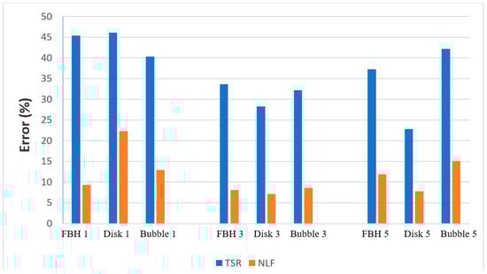 The maximum relative errors of depth prediction by NLF method were about 12% and 11%, respectively, for the disk-like and FBH defects (D = 1 mm, d = 0.2 mm). In fact, such errors were expected because of the influence of a finite heat pulse that is particularly essential for shallow defects. However, in most cases, the errors did not exceed ±5–6% without a noticeable increase for defects with a higher aspect ratio (Figure 8). This implies that the suggested algorithm accounts for lateral size of defects and can be implemented for characterizing smaller defects. In turn, the relative error by using the TSR method has been significantly higher compared to NLF, and it grows with a lower defect aspect ratio. It is worth noting that the TSR technique has always supplied negative errors (Appendix A), i.e., the predicted defect depths have always been lower than the true depth values.