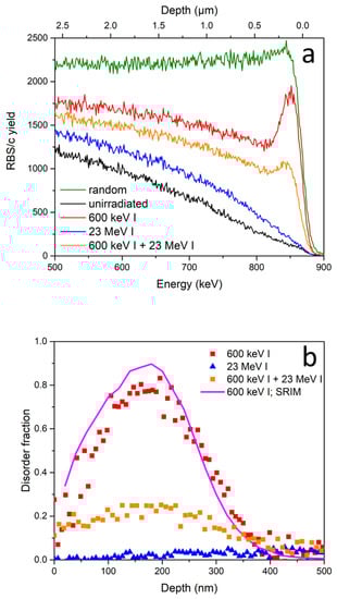 First, we present the results of our study on sequential ion irradiation of silicon. As shown in Figure 1a, spectra obtained by RBS/c measurements provide clear evidence of SHIBIEC when using a 23 MeV iodine beam. As expected, after irradiation of pristine silicon with only 23 MeV iodine up to a fluence of 1014 ions/cm2, only a low concentration of point defects were found that caused slight de-channeling of the probing RBS/c beam. The observed de-channeling cannot be caused by electronic stopping that is well below the threshold for ion track formation in silicon. These defects were most likely produced by the very low, but not negligible nuclear stopping component of the 23 MeV iodine beam. Irradiation with the 600 keV iodine beam to a fluence of 1014 ions/cm2 produced a shallow but highly damaged layer of material. Analysis of the RBS/c spectra using a two-beam approximation [24] yielded a depth of the damaged layer of ~300 nm, with a disorder fraction of up to 80% as shown in Figure 1b, and in accordance with the TRIM code simulations [23]. Finally, the RBS/c spectrum obtained from the sample area exposed to sequential ion irradiation with 600 keV and the follow-up 23 MeV iodine beam, both to the fluence of 1014 ions/cm2, shows a much lower amount of damage. This is clearly seen as the height of the observed peak around 850 keV is very much reduced, and quantitative analysis shown in Figure 1b indicates the reduction of the disorder fraction from 80% down to 25%. As shown in Figure 1c, the electronic stopping of the silicon for the 23 MeV I beam is nearly constant over the damaged region, hence reduction of the disorder fraction appears to be proportional to the initial level of disorder.