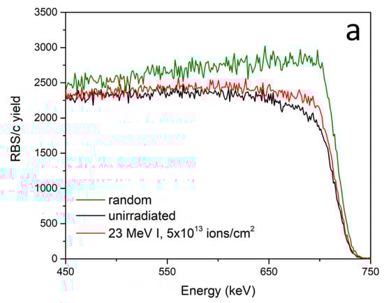Figure 3a shows spectra obtained from RBS/c measurements. The probing beam was 1 MeV protons because spectra obtained with the He beam had a much lower count rate, although the He beam has been used in the past for channeling experiments in HOPG [28,29]. It was possible to achieve channeling in HOPG because the mosaic spread was low, around 0.4°, demonstrating good sample quality. As shown in Figure 3a, irradiation of HOPG with 23 MeV I up to 5 × 1013 ions/cm2 introduced only a small amount of damage into the material. Considering the yield increase with respect to the virgin and random spectra, the amount of damaged material is estimated to be around 10%. For the given fluence, and considering possible ion track overlap, the radius of the ion track is estimated to be r = 0.25 nm. Clearly, these ion tracks are very small and most likely discontinuous in nature [27,30]. In our opinion, a 23 MeV I beam is below the threshold for ion track formation and what we observed is only subthreshold damage consisting of clusters of defects produced along the ion trajectory [31] with a damage cross section of σ~0.2 nm2.