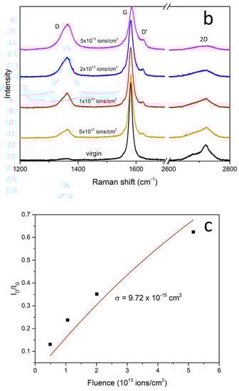 To evaluate damage cross section from Raman spectroscopy measurements, ion track overlap at high fluences has to be considered [5,7]. Only for low ion fluences, damage increases almost linearly with the fluence, and this is observed in Figure 3c. For high enough ion fluences, ion impact into already damaged material will not produce further increase in the intensity of D-band. This type of single ion impact damage kinetics is described by the Poisson law [7] and fit to the experimental data is presented in Figure 3c. By considering a saturation value of ID/IG at 1.7 [20], we estimated the damage cross section in HOPG from Raman spectroscopy measurements to be σ = 0.97 ± 0.09 nm2. This value was larger than the damage cross section obtained from RBS/c measurements, but is also in agreement with previous works where Raman spectroscopy yielded larger ion track sizes than other techniques like TEM [36]. While the TEM and RBS/c measurements of ion track sizes agree very well [37], Raman spectroscopy is sensitive not only to the ion track itself, but also to defects in the ion track halo, as well as strain fields surrounding the ion track [36]. The phase transformations of HOPG into graphene and diamond were observed previously due to irradiations with cluster ion beams and highly charged ion beams, with bands observed at 1300 cm−1 and 1443 cm−1 designating the transition into nanodiamond [38] and a band observed at 2643 cm−1 that indicates the transition into graphene [39]. None of these peaks have been observed in our spectra, indicating that the electronic stopping power which we used was too low to induce any of those phase transformations.