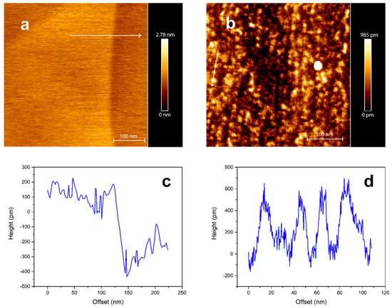The irradiation effects on the HOPG surface morphology were also studied. As shown in Figure 4, irradiation of HOPG at a grazing angle of 1° with respect to the surface does produce ion tracks that can be observed with AFM under ambient conditions. Compared to the unirradiated area that exhibits a very flat surface shown in Figure 4a, many ion tracks are visible on the sample area exposed to the 23 MeV I beam (Figure 4b). Figure 4c shows height profile of unirradiated HOPG surface indicated with a white arrow on Figure 4a,d shows height profile of irradiated HOPG surface indicated with a white arrow on Figure 4b. It is visible that unirradiated HOPG has smooth surface with corrugation in range of 100 pm within one terrace and that after irradiation HOPG has visible ion tracks that corrugate surface more than 500 pm. These tracks have a distinct discontinuous morphology [40], that is also observed in other materials [2,41,42,43,44,45] due to the locally varying electronic stopping power experienced by the SHI when passing through atomic layers at grazing incidence.