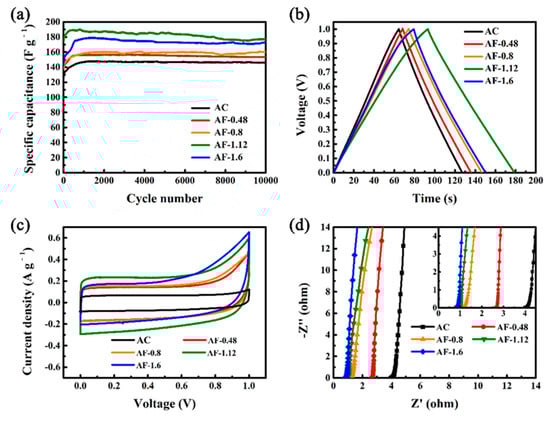 The capacitive performances of AC and Fe@C composites were investigated in 6 M KOH for over 10,000 cycles. As shown in Figure 4a, as Fe-doping content rises, the specific capacitance increases from 146.7 F g−1 (AC) to 186.2 F g−1 (AF-1.12) and then decreases to 173.2 F g−1 (AF-1.6). AF-1.2 exhibits the highest specific capacitance of 186.2 F g−1, 26.9% higher than that of AC. The enhanced electrochemical performance can be attributed to the introduction of Fe/Fe3O4, which increases the pseudo-capacitance by redox reactions in the interface between the electrode and the electrolyte. The specific capacitance of AF-1.6 is 173.2 F g−1, which is smaller than that of AC-1.2. The reduction of specific capacitance can be attributed to the reduction of the double-layer capacitance caused by the destruction of the microporous structure and the reduction of specific surface areas. After 10,000 cycles, the specific capacitance of AF-1.12 remained at 178 F g−1, indicating excellent cycle stability (Figure 4a). The degradation in long-cycle performance is caused by the instability of increased pseudo-capacitance by Fe and its oxides. The GCD curves of Fe@C composites appear nonlinear and asymmetrical, suggesting a strong pseudo-capacitive behavior (Figure 4b) [44,51,57].