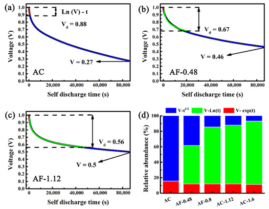 The main form of self-discharge of charged SCs relies on voltage attenuation [12,63]. The devices undergo two and a half cycles of charge/discharge (at 1 A g−1) and then hold at 1 V for 2 h to reduce the influence of uneven charges on the electrode surface. As shown in Figure 5a, the potential of AC drops to 0.27 V after 24 h, equivalent to 73% voltage loss in the SCs. By comparison, AF-0.48 takes the same time to drop its potential to 0.46 V, equivalent to only 54% voltage loss. The increase in Fe and Fe3O4 contents leads to the gradual decline in the voltage loss of SDC. Compared with the potential decay of AC, that of AF-1.12 is reduced by 39.7% (0.56 V, equivalent to only 44% voltage loss) after 24 h. According to the mathematical models proposed by Conway et al., the potential decay is caused by three mechanisms of SCs, consisting of ohmic leakage, Faraday reaction, and diffusion (Figure 6) [12,14]. The potential decay is caused by the internal resistances between the positive and negative electrodes, which can be described by the ohmic leakage mechanism in Figure 6b (V ~ exp(t)) [63,64]. As shown in Figure 6c, the potential decay is attributed to the departure of ions from the electric double layer during the SDC process, which is the diffusion mechanism (V ~ t1/2) [12,24]. The potential decay is related to the redox reactions of impurities on the electrode surface, which can be described by the Faradic redox mechanism (V ~ ln (t)) (Figure 6d) [14,24,62]. Combining the potential decay caused by all three mechanisms, Equation (1) can be obtained [63,65].