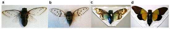 Photos of the cicada wings used in this work: (a) Megapomponia intermedia (ME); (b) Ayuthia spectabile (AY); (c) Tosena splendida blue (TO); (d) Trengganua sibylla (TR).