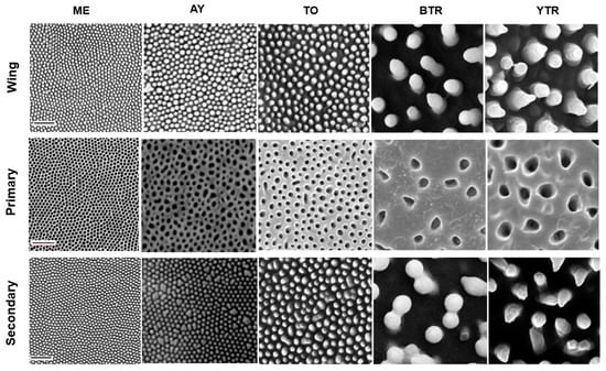 A SEM image and the diameter measurements of a secondary mold of the AY retrieved from a fragment produced from the drop-cast molding method above has been added to Table 1 to show that even in unsuccessful samples, the replication fidelity is very good (the pore size of AY primary was 156 ± 14 nm and the diameter of the AY secondary mold was 156 ± 10 nm). The height of the AY secondary fragment was unable to be obtained due to sample loss prior to further imaging. The molding of the AY wing using the chamber was not attempted in this work. Figure 2 shows the side-by-side comparison of the SEM images of the wings, the primary molds, and the secondary molds. Direct visual comparison of the SEM images for all samples indicated that the molding was highly successful, with excellent replicas of the wings made in PEG. Directly comparing the feature sizes of the pillars in Table 1 supports this conclusion. Although there were differences between the wing and the secondary mold structure diameters (ME ± 4%, AY ± 25%, TO ± 9%, BTR ± 9%, YTR ± 13%) and also with wing structure heights compared to molded (ME ± 10%, TO ± 9%, BTR ± 1%, YTR ± 13%), the small amount of shrinkage which can happen with UV-curable materials in combination with the natural variation of the wing leads us to believe these are insignificant [62,63,64]. The molding method also enabled replica molding of the larger, micron-scale features on the wings, as seen in Supplementary Materials Figure S8. In addition, where calculated, the aspect ratio remains similar to that reported for the wing, showing that there is no collapse of pillars or indeed excessive shrinkage of features. The WCAs of the secondary molds were measured (Table 1) and were shown to be generally similar to those of the primary molds, but not as high as the wing. The commonly used Wenzel model for measuring WCA on rough surfaces states that the apparent WCA will usually decrease when <90°, as the water will fill any pockets of air around the nanostructures, increasing contact between the solid and liquid interfaces [65]. While they are structured, and a higher WCA may be expected, the surface chemistry of the PEG material results in a lower WCA than those of the waxy wings [66].