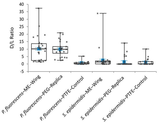 Ratio of dead/damaged cells to live cells of adhered Pseudomonas fluorescens and Staphylococcus epidermidis cells onto microstructured ME wing, PEG replica and a non-structured PTFE control surface. Cell dead/live ratios (D/L Ratio) were calculated by dividing surface coverage data from SYTOX Green-positive and propidium iodide-positive with mCherry-tagged cells and Syto-9-positive cells, respectively. Box plots show the interquartile range, black whiskers indicate standard deviation, and black lines indicate median. Internal blue dots represent the mean and the internal error bars represent standard error of the mean.