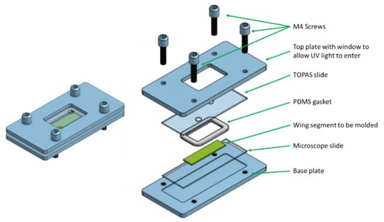 Molding using 100% PPGDA as the primary mold and 100% PEGDA as the secondary mold was investigated. However, PPG primary molds were too thin and caused handling problems when the secondary mold was being made. For this reason, a molding chamber (Scheme 1) was developed, within which the molding was set in a confined space, where control of the x, y and z dimensions was possible. The confinement of the prepolymer limited spreading across the wing samples, facilitating control of the overall thickness of the resulting mold. The main benefits of this chamber included a leak-proof system, an interchangeable PDMS gasket for determining the x, y and z dimensions of the mold being produced, and the ability to add prepolymer solution via an inlet when under a nitrogen environment to eliminate the presence of air bubbles.