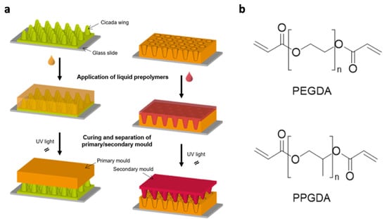 The following are available online at https://www.mdpi.com/article/10.3390/ma14081910/s1, Figure S1 —AutoCAD diagram of stainless-steel molding chamber used for replica molding of ME wing, planar PPGDA, and planar PEGDA samples. Figure S2—Tilted SEM images of the cicada wings (all scale bars are 1 μm) ME, AY, TO, BTR, YTR from top to bottom (images tilted at 45°). Figure S3—SEM top-down images of primary molds of ME (PEG and PPG), AY, TO, BTR and YTR (all scale bars are 1 μm). Table S1—Contact angle measurements and calculated surface free energy on planar PPG and PEG molds using the OWRK model. Figure S4 - Snap cleave SEM images of the primary molds from the different wing samples. Figure S5—Photos demonstrating the drop cast method of molding of the BTR wing (left) to form the primary mold. The fixed primary mold (right) being used to fabricate the PEG wing replica. Figure S6—Images of contact angles for surface free energy measurements of PEG and PPG using water and diiodomethane as test liquids. Figure S7—Image of secondary PEG molds produced from the two different methods described in the paper. Figure S8—SEM images showing larger micron scale features present on the cicada wing replicas. Figure S9—3D models of the cross section of the arrays on the wings created using OnShape software (top row) and top-down views of the 3D models (bottom row). Figure S10—Graphs showing total surface area, surface area to volume ratio, pillar density per µm2 and average spacing at the base of the pillars. Figure S11—Graph showing P. fluorescens and S. epidermidis surface coverage. Figure S12—Epi-fluorescence microscopy images of P. fluorescens and S. epidermidis bacteria on surfaces. Figure S13—SEM images of P. fluorescens cells on ME wing and PEG replica.