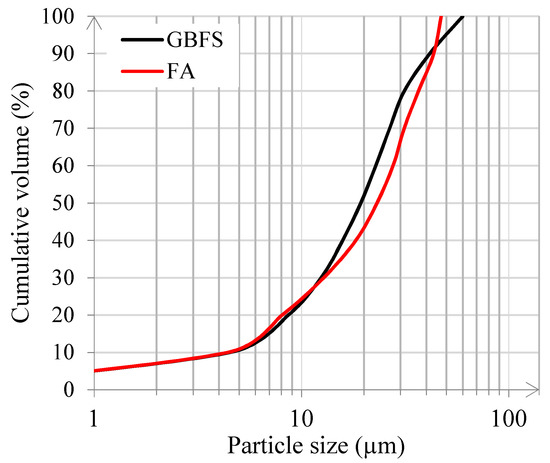 Figure 2 shows the particle size distributions of the GBFS and FA, which were measured with the EyeTech Laser diffraction analyser. An external ultrasonic bath was used for the deagglomeration of the particles in order to increase the dispersion efficiency. The d50, which represents the particle size of the group of particles, was 19 μm for the GBFS, while for the FA, d50 was 21 μm. According to the literature, the dissolution of the GBFS is dominated by small particles. Particles with a size >20 μm react slowly, while particles with a size <2 μm react completely after 24 h in blended cement and alkali-activated binders [21,22].
