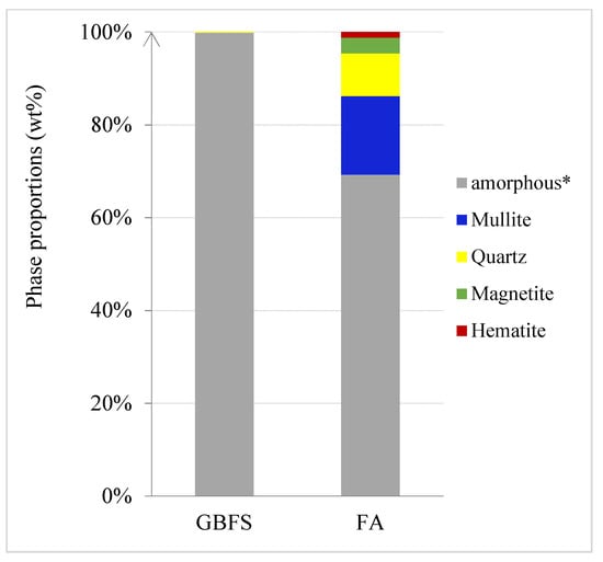 X-ray diffraction (XRD) is used to study the minerology of raw materials. Figure 3 shows the quantitative phase analysis with the Rietveld method for the GBFS and FA. It can be seen that the GBFS is fully amorphous, while the FA is a mixture of amorphous (69 wt%) and crystalline phases, such as quartz, mullite, magnetite and hematite.
